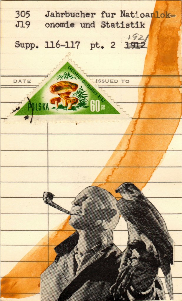 Grad school came and went, and I had used a small fraction of those due date cards as bookmarks as I devoured scholarly tomes on German philosophy. My interests moved from a desire to theoretically understand the creative process to actually engage in it, and the collection of due date cards felt like the perfect place to begin bringing my aesthetic influences together in a visual medium. Those library due date cards were not the only vintage paper collection I had from which to draw images and visual ideas; an old postage stamp collection handed down to me by both my maternal grandfather and paternal grandmother shared with the library cards an ephemeral connection to an almost obsolete past (posting physical letters in the mail) and a similar sepia tinted pallet of yellowing paper and engraved printing.