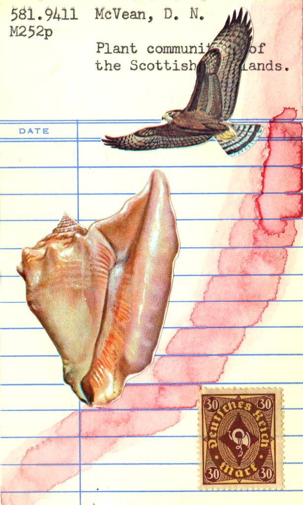 Postage stamps and due date cards also happen to have the same scale, and so I began to play with stamps positioned on the card. Magazine cut outs, game pieces, and old identification guides for flora and fauna provided a wealth of imagery from which to draw. Experimentation would eventually add the watercolor curve across the card beneath the imagery in to make what would become hundreds in a series that I titled Eternal Return, a series that continues to expand to this day.