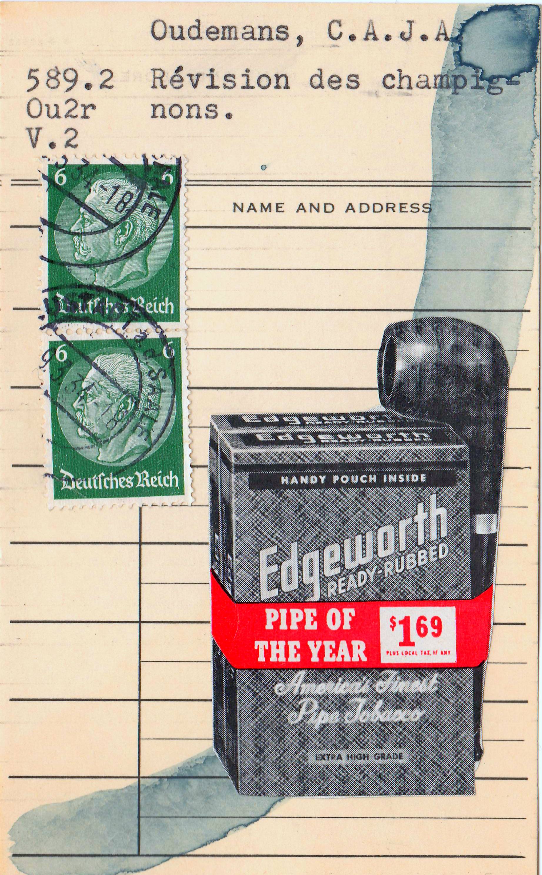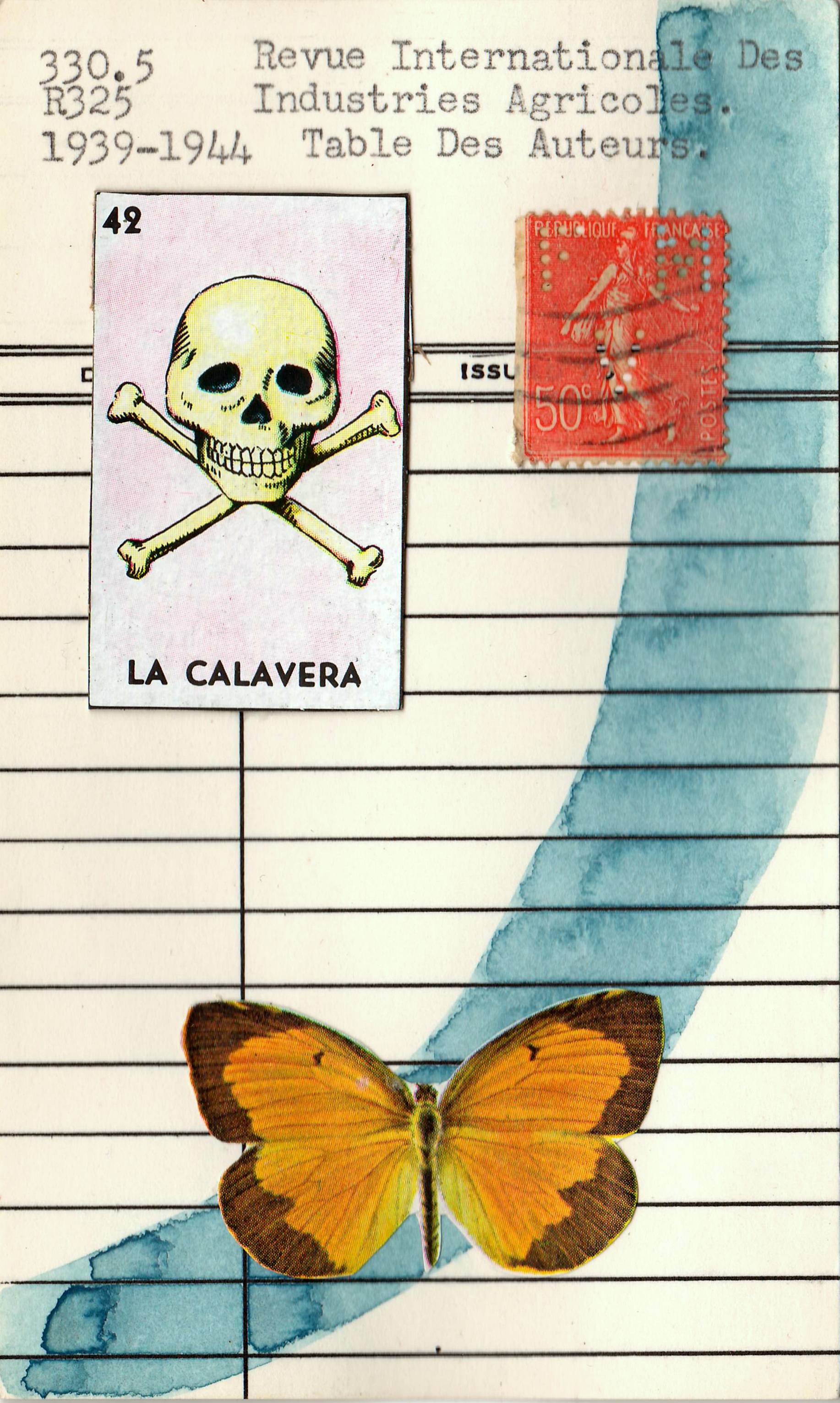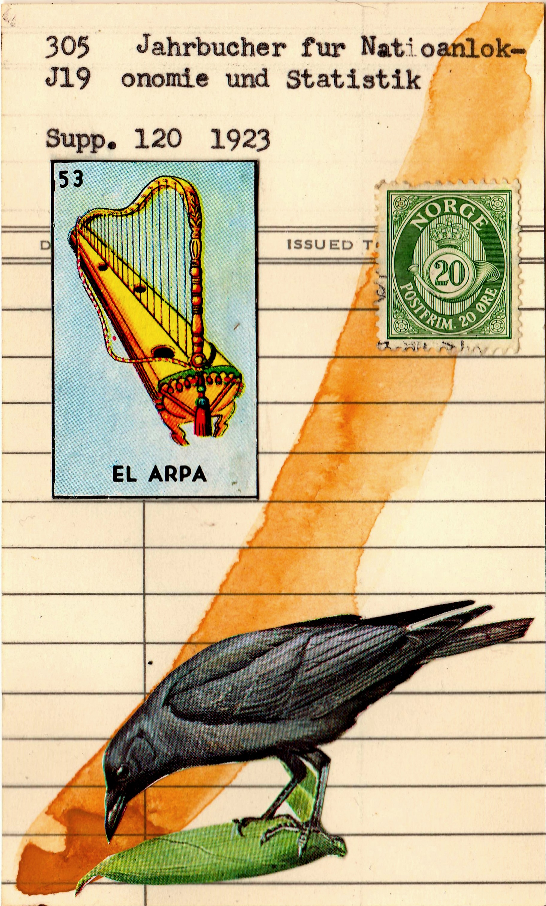 Grad school came and went, and I had used a small fraction of those due date cards as bookmarks as I devoured scholarly tomes on German philosophy. My interests moved from a desire to theoretically understand the creative process to actually engage in it, and the collection of due date cards felt like the perfect place to begin bringing my aesthetic influences together in a visual medium. Those library due date cards were not the only vintage paper collection I had from which to draw images and visual ideas; an old postage stamp collection handed down to me by both my maternal grandfather and paternal grandmother shared with the library cards an ephemeral connection to an almost obsolete past (posting physical letters in the mail) and a similar sepia tinted pallet of yellowing paper and engraved printing.