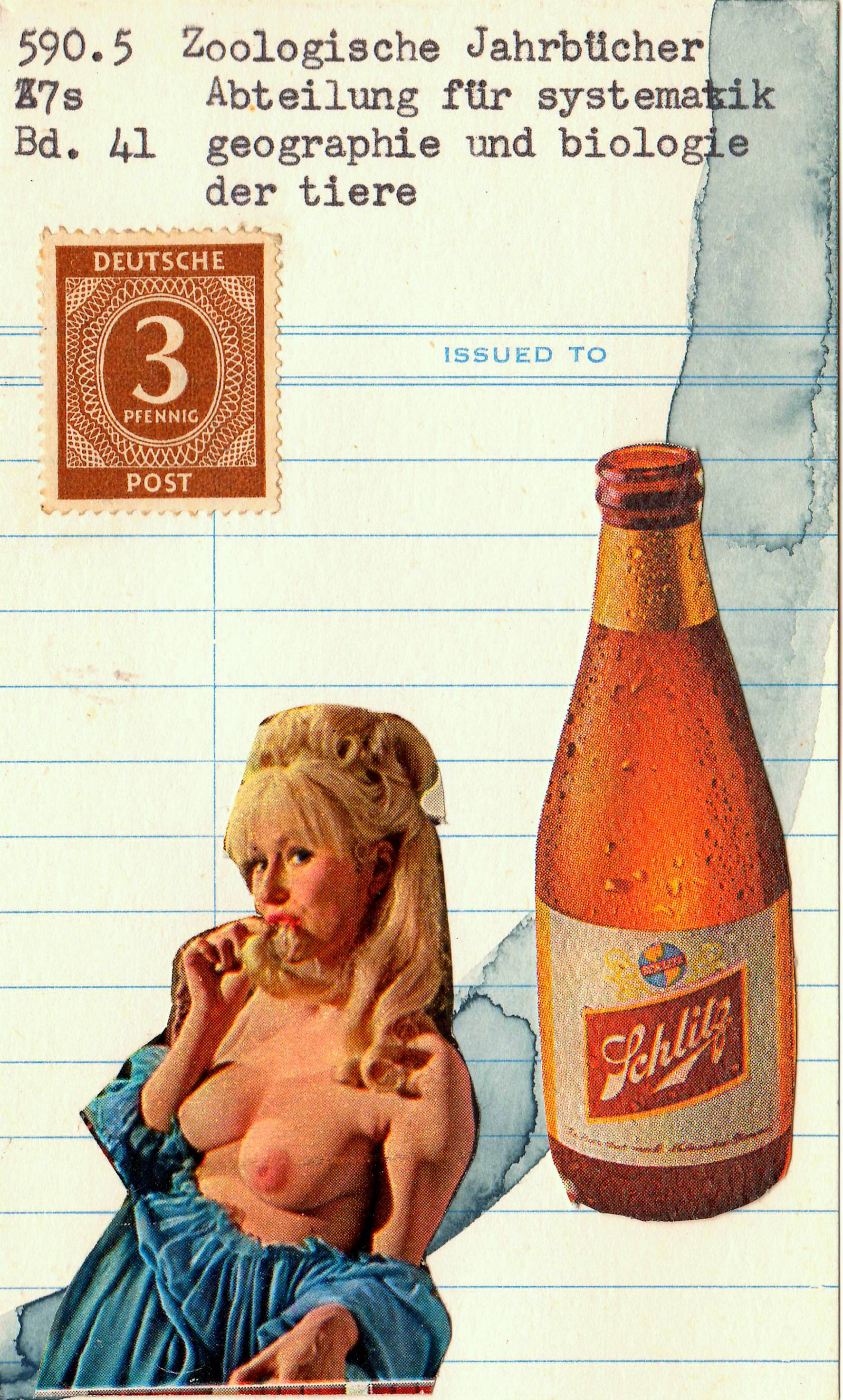 During a year off of school while I was applying to grad programs, I took a job at the Purdue University Libraries to hold me over until my studies could resume. My desk there was thirty feet underground in the storage stacks where ancient periodicals and other books with low circulation were kept on movable shelving in a bomb shelter like basement of the undergraduate library. One of my duties there was replacing the old due date cards kept in manila pockets inside the covers of those old books and academic journals with bar codes. Instead of throwing out the cards with titles and Dewey Decimal numbers hand typed on the yellowing card stock, I kept them, and so the seeds of the Eternal Return collage series were planted.